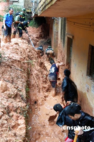 八月四日上午,台风“派比安”突袭广东四会,当地城区新风路一巷十九号房屋后面山坡发生山坭倾泻,警员王继贤在援救被困市民时被埋,经紧急抢救无效因公殉职。图为警员在现埸挖掘救援。中新社发 黄耀辉 摄