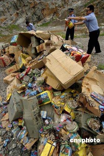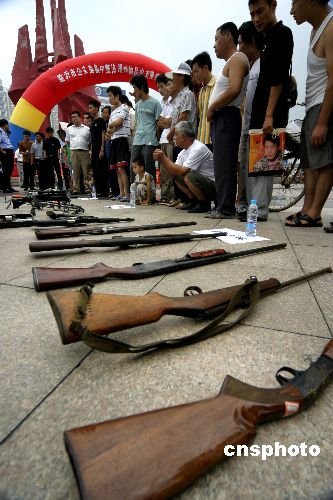 8月7日,山东省临沂市公安局开展了“收枪治爆”宣传活动,把从社会收缴的300余件非法枪支弹药、管制刀具在人民广场公开展示,并对10万多响非法烟花爆竹焚烧销毁,彻底消除社会安全隐患。中新社发 朱武涛 摄