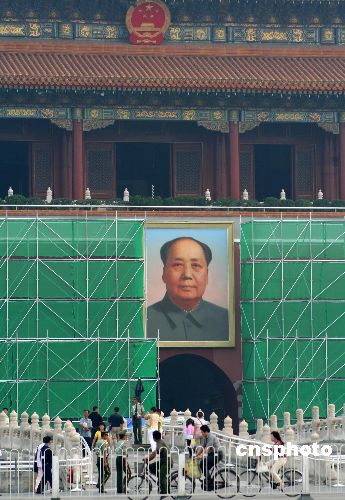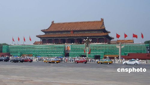 8月23日,北京天安门城楼施工围拦全部搭建完成,维护保养工作全面展开。中新社发 玉龙 摄