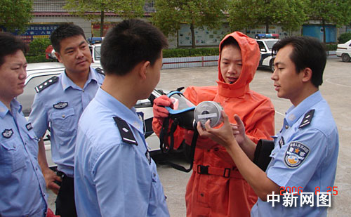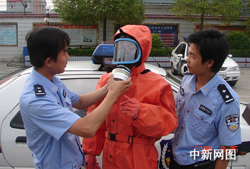 中新网8月25日电 8月24日,湖北省政府拔专款为全省高速巡警配备了两百余套危化物品专业防化服和防毒面具,以应对高速公路沿线危险化学品运输车辆泄露事故等突发事件,这在湖北交警系统尚属首次。此次配发到一线巡警手中的装备分为全封闭防化服和防毒面具两种,分布在全省高速公路沿线的十三个高管大队分别配发了6套防化服和10个防毒面具及滤罐。(陈刚、韩涛 摄)