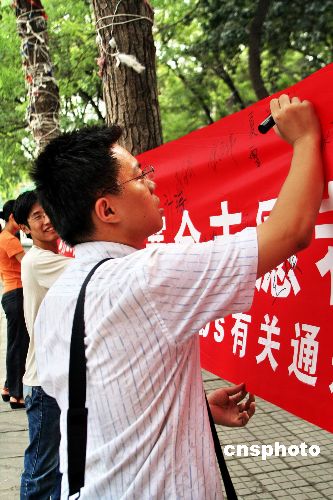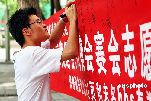 北京大学2008奥运会、残奥会的赛会志愿者报名工作正式开始。8月28日,北大的校园内挂起了志愿者报名的宣传横幅,路过的学生纷纷驻足留言签名,表达自己对2008北京奥运会的良好祝愿,以及对志愿者工作的支持。中新社发 冯昕 摄