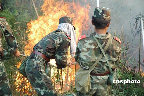 九月二日下午七时许,重庆北碚的森林大火已燃烧八十小时。图为武警官兵奋力扑火。中新社发 郭晋嘉 摄