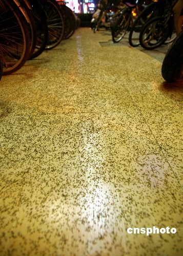 近日,南京城突然来了一群不速之客。成群的褐色小飞虫在城区肆虐,所过之处,天空就像下起“虫子雨”一样,一不小心虫子就钻进人的怀里、眼里和嘴里,甚至沾满了衣服,跟随市民“登堂入室”。扑面小虫原是南来稻飞虱。褐飞虱去年就曾给南方各省及江苏省沿江、苏南部分地区造成较严重的危害,江苏省农林厅下通知防稻飞虱。中新社发 吴俊 摄