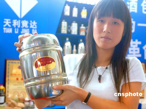 九月五日,北京天利竟达国际机械设备有限公司的公关小姐在“2006中国国际啤酒饮料制造技术及设备展览会”上,持三升新啤酒桶,向观众积极推荐具有中国自主知识产权的“啤酒不锈钢循环包装容器”。据介绍,这种容器啤酒达到了与国际接轨、节约、环保可循环使用等优点,避免了玻璃瓶不安全性,而使啤酒口味性得以提高。中新社发 邹宪 摄