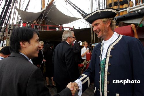 九月六日,停靠在上海浦江边的瑞典仿古帆船“哥德堡”号揭开了其神秘面纱,正式对公众开放接受市民登船参观。不过,每批登船游客的逗留时间只有短短的二十分钟。图为“哥德堡”号“船长”在欢迎游客登船。中新社发 汤彦俊 摄