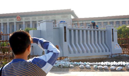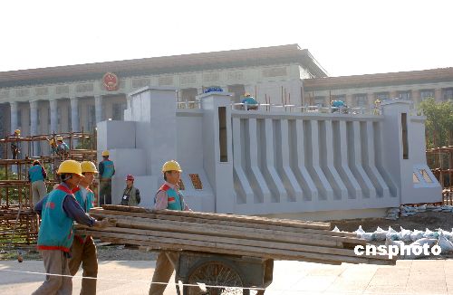 二○○六年九月十日,北京天安门广场的第一座国庆节日花坛----“三峡大坝”景观初步建成。天安门广场下一步还将搭建“布达拉宫与青藏铁路”、“吉祥福娃一路欢歌迎奥运”、中心主题花坛“万众一心”等大型花坛,供市民观赏。中新社发 邹宪 摄