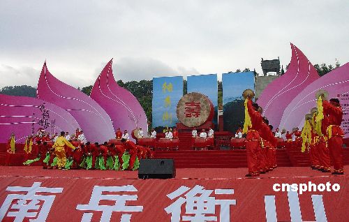 9月12日上午,由国家旅游局、湖南省人民政府主办的2006年中国湖南旅游节开幕式暨南岳衡山国际寿文化节在此隆重启幕。图为开幕式大型文艺演出“万鼓衡岳风”现场。中新社发 李思之 摄