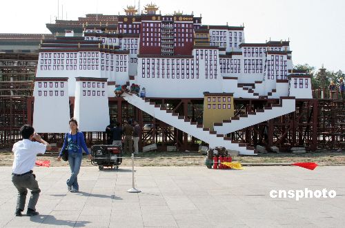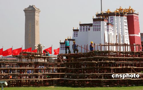 9月12日,北京天安门广场的第二座节日花坛——“布达拉宫”景观初步建成。天安门广场下一步还将搭建“三峡大坝”、“青藏铁路”、“吉祥福娃一路欢歌迎奥运”、中心主题花坛“万众一心”等大型花坛,供市民观赏。 中新社发 吴芒子 摄