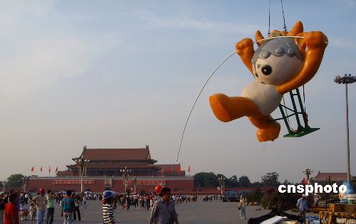 9月18日中午12点,北京天安门广场的施工人员开始安装福娃“晶晶”,经过6个小时的连续作战,到傍晚18点,最后一个福娃“妮妮”就位。“五福娃”成为此次国庆摆花工程又一亮点。