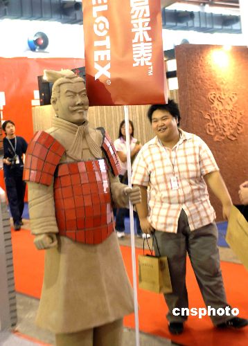 九月二十日,在北京中国国际展览中心举办的“2006亚洲建筑展”上,一家建材展台摆出两尊持当代广告牌的陕西秦兵马俑,其兵团作战的气度,引起观众的笑声。在奥运商机带动下,目前北京建材市场火热异常。中新社发 邹宪 摄