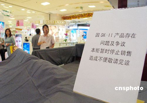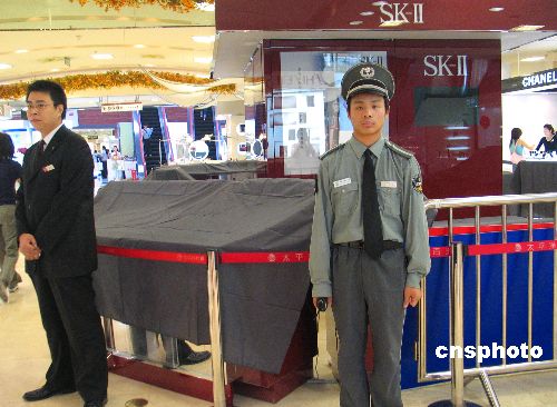SK-II品牌化妆品近日出现风波。9月22日上午,在北京一些商场,SK-II产品已下货封柜,并在柜台上竖起一张告示牌“因SK-II产品存在问题及争议本柜台停止销售”,同时派一名保安专门看管SK-II专卖柜。中新社发 吴芒子 摄