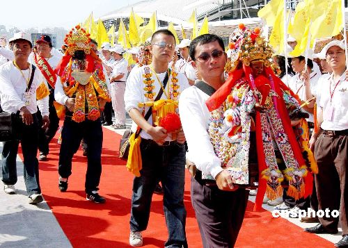 | 9月25日,“妈祖接驾仪式”在厦门国际旅游客运码头举行。当日,数千名台湾始祖信徒代表分别搭乘“金门快轮”、“台华轮”、“合富轮”和“今日之星”等客轮抵达厦门国际旅游客运码头,准备前往莆田参加2006年湄洲妈祖庙、贤良港天后祖祠谒祖进香活动。据悉,这将是迄今为止最大规模的台胞到大陆进香交流活动。据介绍,福建省莆田市湄洲岛是妈祖文化发祥地,岛上的妈祖祖庙是世界20多个国家和地区的妈祖宫庙鼻祖。而台湾有妈祖宫庙3000多座,信众1600多万人,每年前往湄洲朝拜妈祖的台胞多达10万人次。中央电视台和台湾东森电视台等多家电视媒体首次直播台湾信众朝拜妈祖的活动。中新社发 丰晓飞 摄