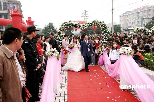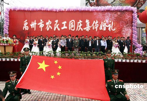 9月30日,河南省禹州市委市政府在禹州市五彩广场隆重举行“禹州市农民工国庆集体婚礼”,33对该市和外地来禹务工的新人喜结连理。中新社发 张燕军 摄