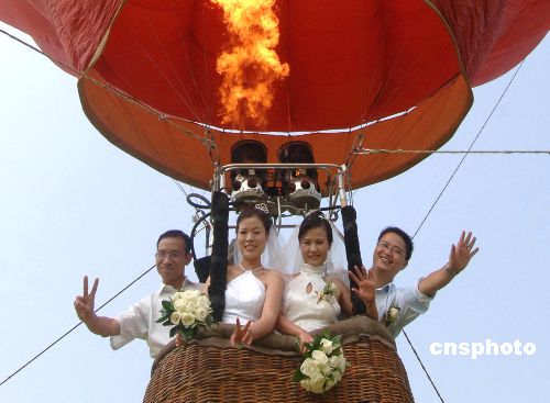 十月一日,两对参加福州“上天入海 见证真情”浪漫集体婚礼活动的新人,乘坐热气球上天体验空中婚礼的浪漫。当日,来自各界的十对新人参加在福州举行的“上天入海 见证真情”浪漫婚礼系列活动。中新社发 刘可耕 摄