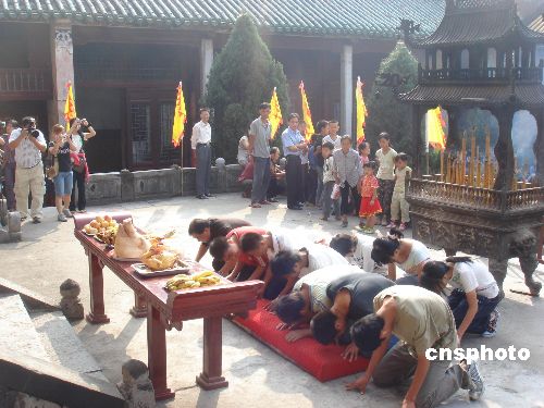 十月三日,当地中学生在恭城文庙大成殿前祭拜孔子。当天,广西恭城瑶族自治县文庙隆重举行孔子聖诞二千五百五十七年纪念活动,数千名外地游客与当地居民参加了祭拜仪式。中新社发 欧惠兰 摄