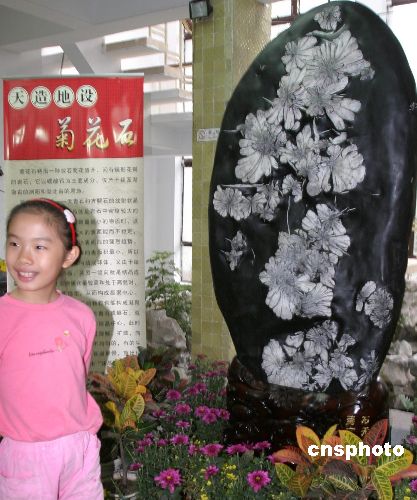 10月3日,游客在“菊花石之王”前留影。国庆黄金周期间,一块高2.3米,宽1米的大菊花石在南京玄武湖展出。据介绍,这是目前国内发现的最大菊花石。菊花石特指一种状若菊花盛开、间有蝶形花瓣的岩石,它以碳酸钙为主要成份,仅产于我国湖南省浏阳和湖北省恩施。中新社发 陈永 摄