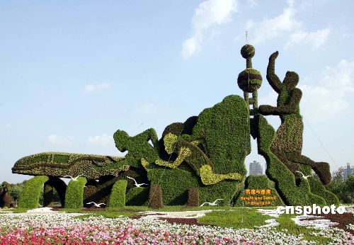 在国庆中秋佳节期间,被誉为植物雕塑的国际“立体花坛”成为上海旅游新景观。来自加拿大、法国、美国、希腊、韩国、中国等十五个国家的八十二件立体花坛作品,以新颖的艺术造型、鲜明的民族风格,共同演绎“地球·家园”的主题。图为立体花坛作品《高度 速度》,设计虚实互补,由小巨人姚明与东方明珠比高低、刘翔奋力跨栏的造型表现了中国的发展和巨变。中新社发 潘索菲 摄