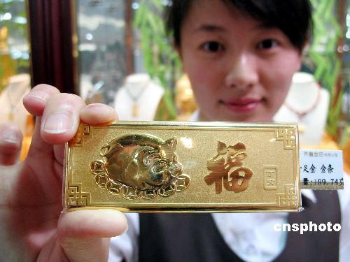10月9日,济南泉城路齐鲁金店营业员展示刚刚上市的猪年系列金条,其中最大的重达近200克。由于近来国际黄金价格下跌,国内金价也有一定幅度下调,引发了一些市民的购金热情。中新社发 周青先 摄