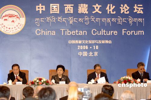 由中国西藏文化保护与发展协会主办的首届“中国西藏文化论坛”十月十日在北京隆重开幕,全国人大副委员长热地,全国政协副主席、中央统战部长刘延东,全国政协副主席帕巴拉·格列朗杰等出席开幕式。该论坛旨在推动更多国内外有识之士进一步认识西藏、走进西藏、热爱西藏,搭建西藏文化对外交流的平台,进一步推动西藏文化的保护与发展事业。中新社发 徐曦弋 摄