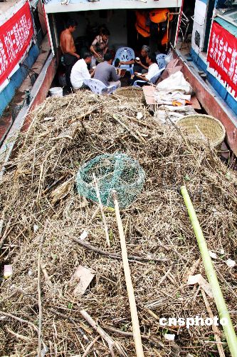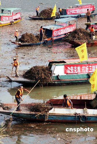 10月13日,重庆云阳新县城张飞庙前至长江大桥水域,20艘清漂船、120多名打捞人员展开集中会战,“围追堵截”骤然增多的长江漂浮物,为日益逼近156米蓄水目标的三峡水库保洁。据悉,集中打捞活动持续到蓄水完成后仍需跟踪半月时间。中新社发 饶国君 摄