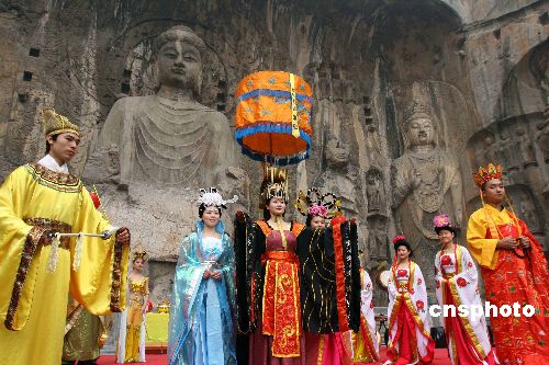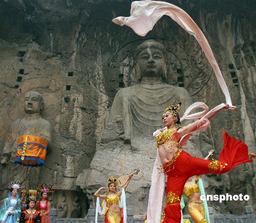 10月16日,河南洛阳龙门石窟景区在奉先寺推出“武皇礼佛献乐舞”表演。整个表演参照龙门石窟的壁画场景、窟龛雕像造型等资料,以宫廷乐舞的形式展现龙门石窟博大的文化底蕴。中新社发 张晓理 摄