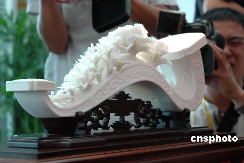 十月十九日,中国—东盟博览会秘书处宣布,型取中国传统如意、寓意“凝聚、绽放、繁荣”的福建德化瓷《国花集瑞》,将作为第三届中国—东盟博览会国礼,赠送给前来与会的东盟国家政府首脑。德化瓷又称“中国白”,白度高达八十八点一,居世界第一,有“白如雪、薄如纸、明如镜、声如磬”的美誉。中新社发 林艳华 摄