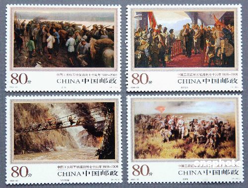 为纪念中国工农红军长征胜利七十周年,中国国家邮政局定于十月二十二日发行《中国工农红军长征胜利七十周年》纪念邮票一套四枚、小型张一枚。邮票图名分别是:送别、飞夺泸定桥、遵义会议、过草地,面值均为八十分;小型张图名是:大会师,面值六元。四枚邮票图案分别选择中国油画师靳尚谊、彭彬、刘国枢、张文源的油画作品;小型张选择国画师李宝林、周顺恺的国画《大会师》主题图案。中新社发 邹宪 摄