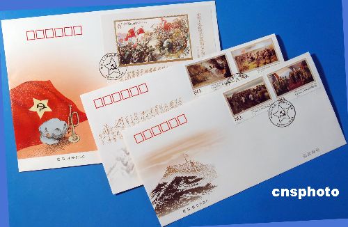 为纪念中国工农红军长征胜利七十周年,北京市邮票公司配合国家邮政局将于十月二十二日发行《中国工农红军长征胜利七十周年》纪念邮票一套四枚、小型张一枚,特设计印制了该邮票的首日封,与邮票同日发行。邮票图名分别是:送别、飞夺泸定桥、遵义会议、过草地,面值均为八十分;小型张图名是:大会师,面值六元。四枚邮票图案分别选择中国油画师靳尚谊、彭彬、刘国枢、张文源的油画作品;小型张选择国画师李宝林、周顺恺的国画《大会师》主题图案。中新社发 邹宪 摄