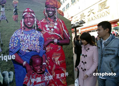 10月28日,为迎接即将召开的“中非合作论坛北京峰会”,北京城王府井步行街上搭设起大幅非洲风情宣传画,峰会营造气氛。中新社发 钱兴强 摄