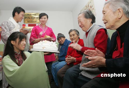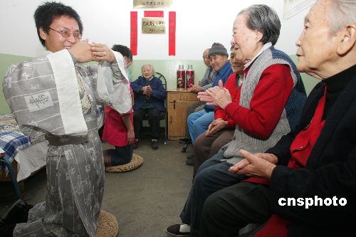 十月三十日是中国传统的重阳佳节,以普及汉民族博大精深的传统文化、礼仪为宗旨的北京“汉衣坊”身着汉民族传统服饰、以汉民族传统礼节看望了北京西城德宝敬老院内的老人,以发扬汉民族爱老敬老的优良传统。中新社发 武仲林 摄