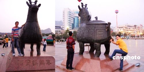 10月30日,游客参观国宝复制品“麒麟尊”时的不同表现。广西贺州的“麒麟尊”是顶级国宝,其复制品落户贺州后,吸引了不少游客前来参观并留影。但游客们的一些不文明行为却让“国宝”蒙羞。中新社发 刘向龙 摄