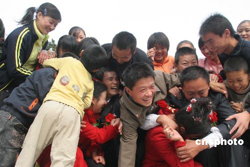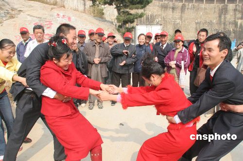 10月30日,在山东平邑蒙山,两对山区青年举行热闹婚礼,那自由自在的婚趣让人忍俊不禁,感受到浓浓的喜气。中新社发 雍君 摄
