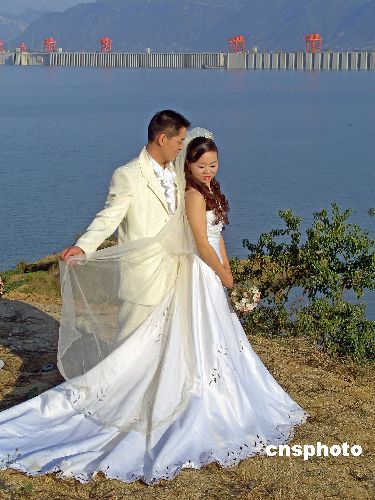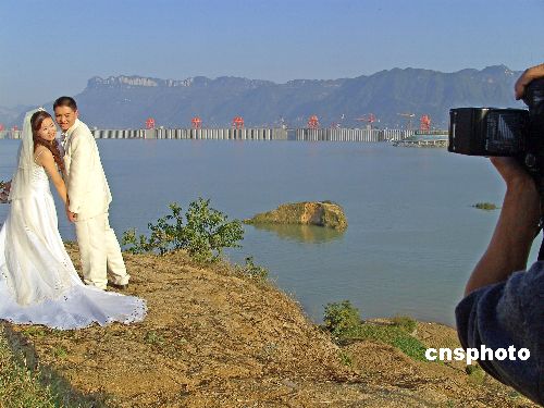 2006年11月1日,某婚纱摄影影楼摄影师在湖北姊归凤凰山脚下以三峡大坝为背景,为一对情侣拍摄婚纱照。据悉,三峡工程实现156米蓄水目标后,秭归凤凰山成了近距离观赏高峡平湖的黄金位置,吸引了很多游人。中新社发 刘君凤 摄