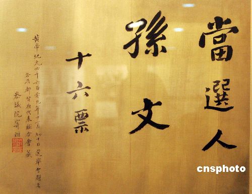 十一月四日,一张孙中山当年当选中华民国临时大总统的选票,作为孤品首次面世展览。这张选票的背景为:一九一一年十二月二十九日,十七省会议代表在南京选举产生中华民国临时大总统,孙中山以十六票绝对多数当选。中新社发 潘索菲 摄