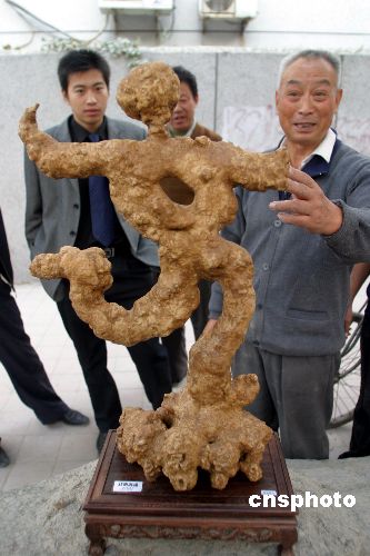 11月8日,在济南市市民陈登棋(左一)向大家介绍自己制作的石雕“2008奥运会会徽”。这个奥运会徽是用4块姜牯石拼接而成,高约70厘米,重20多斤,耗时一个多月制作完成。中新社发 龚辉 摄