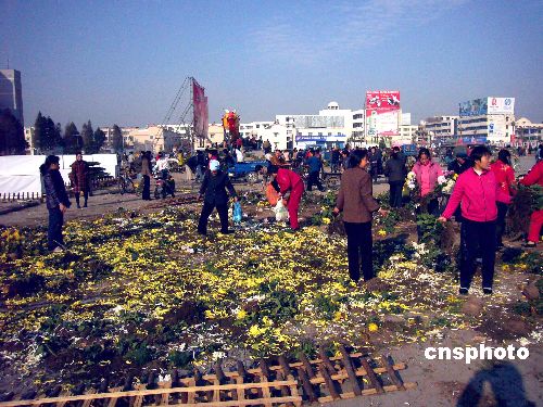 11月15日上午,安徽省界首市政府广场的3万多盆菊花遭到市民哄抢。早晨7时30分,有市民开始搬拿鲜花,现场工作人员制止无效,上午9时许,花篮、花门、花架上的3万多盆鲜花被抢一空,现场一片狼藉。据悉,这些菊花是界首市第二届金秋菊花展开幕时布置的,计划从10月25日开始到11月25号闭幕。中新社发 赵强 摄