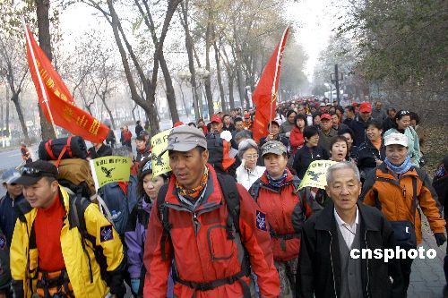 十一月十九日清晨,乌鲁木齐千余名不同年龄段的户外徒步爱好者在乌鲁木齐市北京路集结,浩浩荡荡徒步穿越城市繁华区域,全程达十余公里,为当天在乌鲁木齐开幕的首届新疆户外文化节摇旗助威。新疆因独特的地形地貌、优美的自然环境及极富诱惑力的异域风情,被“驴友”称之为“户外爱好者的乐园”、“徒步者天堂”,目前新疆有四万多人经常参加户外运动,已逐渐成为城市居民闲暇时间休闲、锻炼的一种方式。中新社发 刘新 摄
