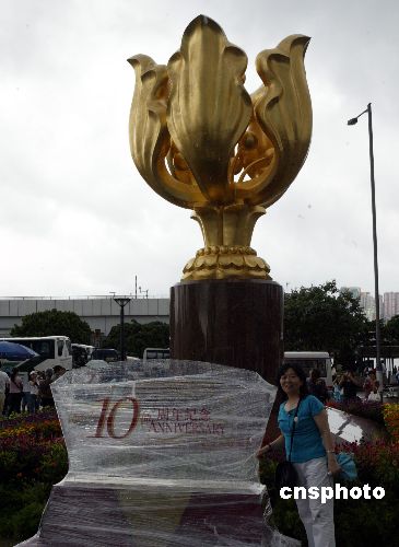 香港回归十周年之际,来自内地的游客纷纷在香港香港金紫荆广场的回归纪念牌前留影。中新社发 任海霞 摄