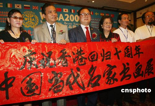 7月1日晚,为庆祝中国共产党成立86周年和香港回归祖国10周年,由世界著名品牌大会主办机构世界品牌组织以及美中经贸投资总商会等联合主办的“2007中国当代名家书画展”在北京举行,来自中国各地的20多位著名书画家在会上展示精品。图为书画展揭幕仪式。中新社发 钱兴强 摄