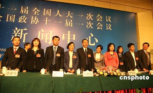 三月六日,十一届全国人一次会议新闻中心举行首场集体采访,十位来自基层的全国人大代表亮相。他们中除一名是导游、一名是教师外,其他均为工人、农民代表。中新社发 吴庆才 摄