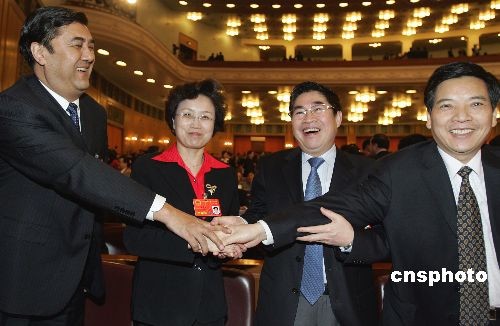 3月8日下午,十一届全国人大一次会议在北京人民大会堂举行第二次全体会议。当日是“三八”国际妇女节,大会开始前,在身材魁伟的新疆自治区主席努尔·白克力(左一)提议下,陕西省省长袁纯清(右二)、云南省省长秦光荣(右一),共同祝贺青海省女省长宋秀岩节日快乐。中新社发 任晨鸣 摄