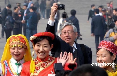 3月10日上午,十一届全国人大一次会议在北京人民大会堂举行第三次全体会议。香港凤凰卫视著名主持人曹景行,在大会堂外抄后路偷袭抓拍靓丽的少数民族代表。中新社发 廖攀 摄