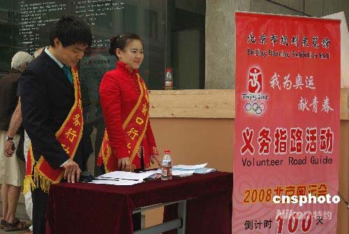 4月29日,在北京奥运会倒计时100天即将到来之际,北京市规划展览馆在前门东大街开展“我为奥运献青春 义务指路活动”,为国内外游客提供义务指路服务。中新社发 九州 摄