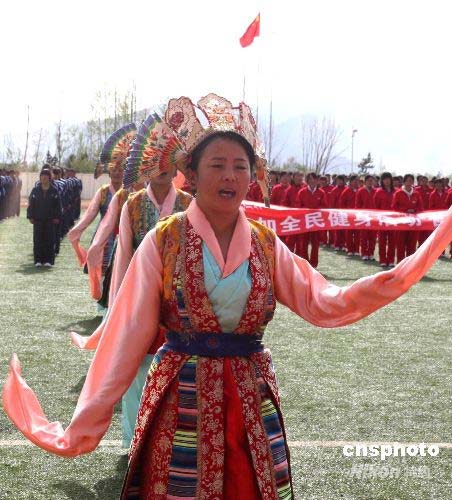 4月30日上午,西藏拉萨举行迎奥运倒计时一百天群众体育庆典活动,各族各界民众一千多人聚会西藏大学,以民族歌舞等方式祝福北京奥运会圆满成功。中新社发 柳俊武 摄