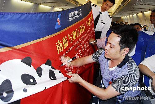 4月30日,北京奥运倒计时100天,南航广州——贵阳的CZ三四一一、CZ三四一二航班上,“南航与奥运同行与冠军同飞 南航旅客支持奥运百万人大签名”活动拉开序幕。中新社发 陈卫华 摄