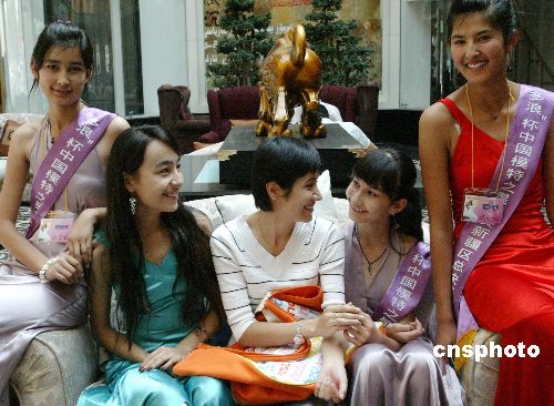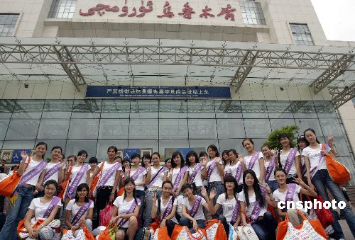 7月25日,2006“多浪”杯中国模特之星新疆总决赛在新疆阿克苏拉开序幕,来自新疆维吾尔族的参赛佳丽集体亮相。中新社发 钱兴强 摄