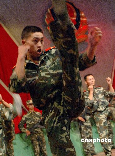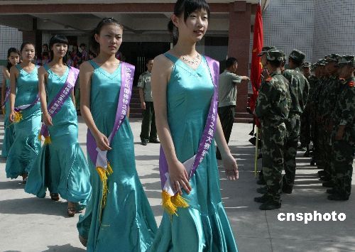 7月28日,为庆祝中国人民解放军建军79周年,正在新疆阿克苏市参加“多浪杯”中国模特之星新疆总决赛的佳丽,来到新疆武警总队支队与武警官兵一起庆祝八一建军节。中新社发 钱兴强 摄