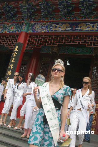 2006第18届环球皇后竞选全球总决赛的46位佳丽,在浙江萧山游览杭州休闲博览会会场之一的东方文化园,感受中国道教佛教文化。中新社发 俊影 摄