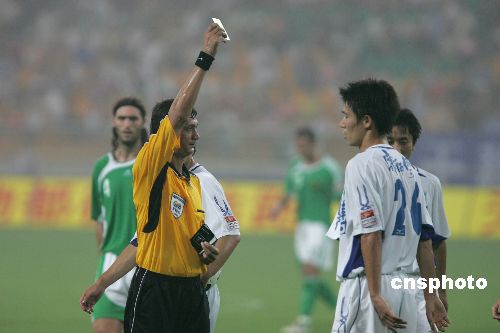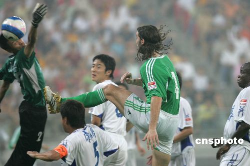 7月30日晚,中超第21轮天津泰达主场对阵北京国安。经过90分钟的较量双方战成0:0。图为本场比赛精彩瞬间。中新社发 苏岩 摄