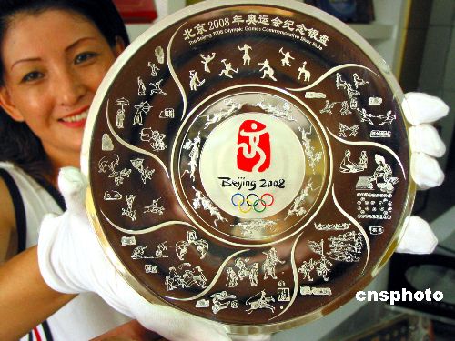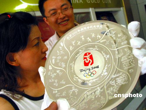 7月31日,“北京奥运纪念银盘”在青岛一家纪念币公司上柜亮相。据介绍,这套由奥组委授权、中国金币总公司发行的纪念币有一公斤和8盎司两种规格,银盘上铸有古代《战国渔猎纹》、《马术图》等古代体育图案。其中一公斤重的银盘是全世界正式发行的规格最大的纪念银盘,总共限量发行2008个。中新社发 赵健鹏 摄